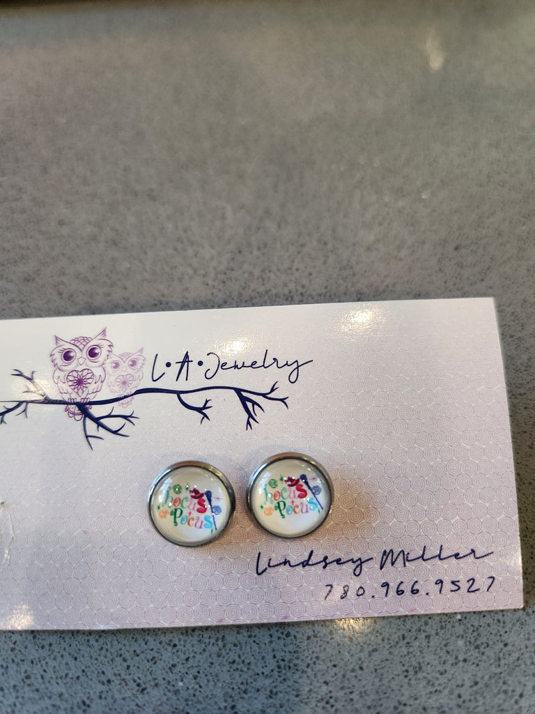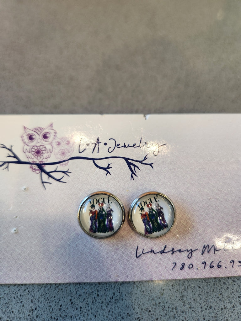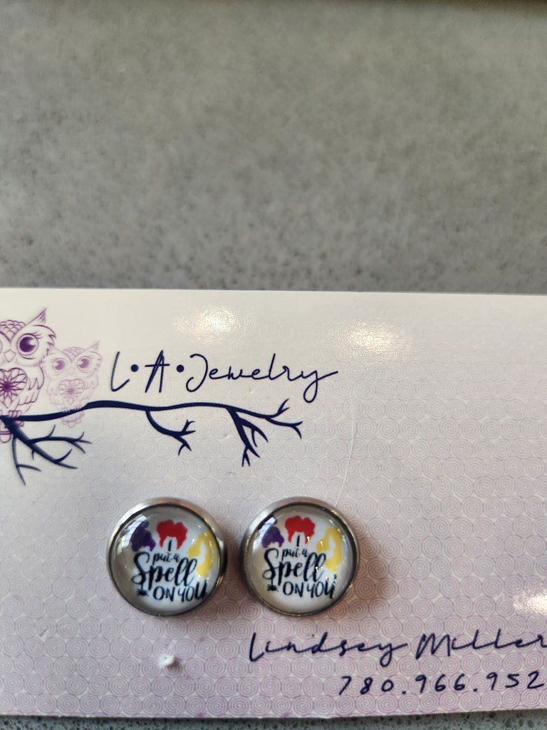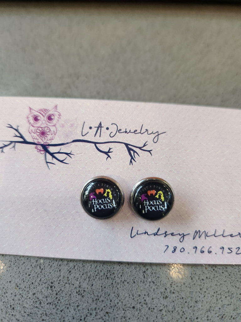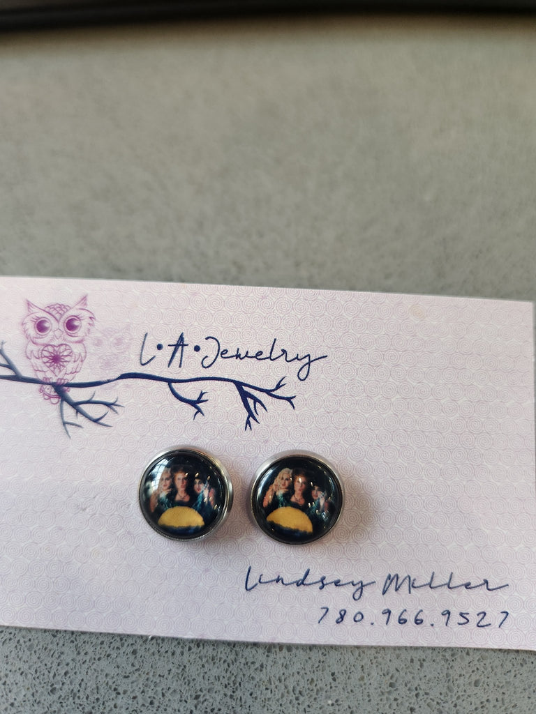 12mm photo glass cabochon Hocus Pocus themed earrings. Stainless steel, nickel free, hypoallergenic backings. One of each kind.