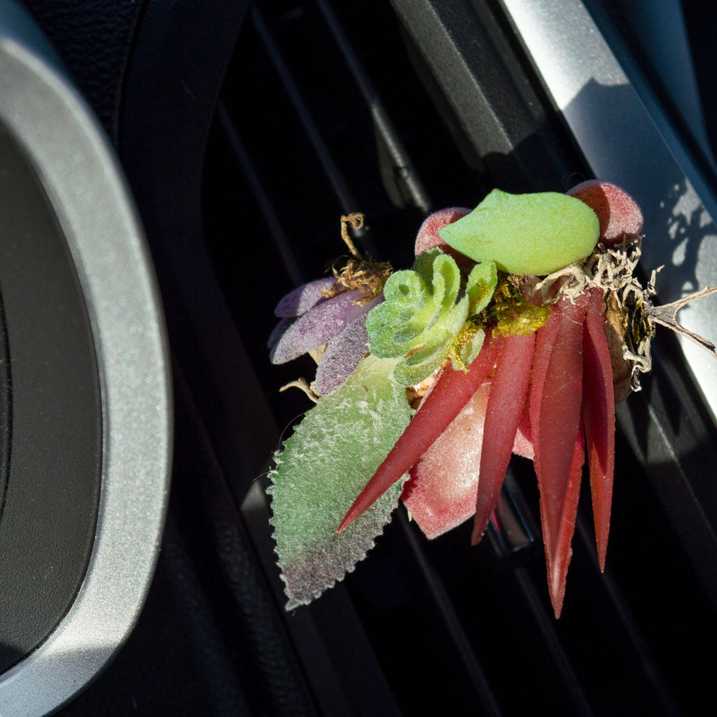 Each one is surrounded by cheerful plastic greenery, giving you the look of a tiny garden without asking you to keep anything alive. Just add a few drops of essential oil to the felt pad, clip it onto your vent, and let the airflow carry the scent. When it fades, add a little more and carry on.